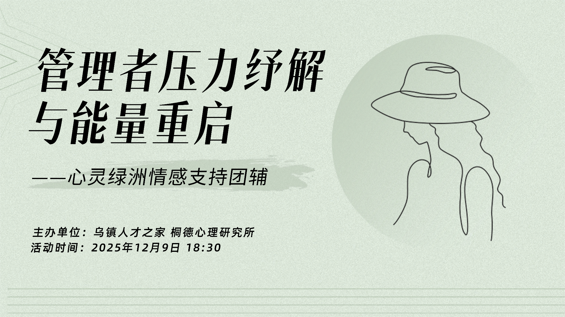 12月9日晚,乌镇人才之家与桐德心理研究所联合打造的“管理者压力纾解与能量重启——心灵绿洲情感支持团辅”活动圆满落幕。心理学博士石鑫珍老师以“理论+实践”双线融合的方式,带领参与者开启了一场从认知到行动的心理赋能之旅。本次活动吸引了十余名来自企事业单位、教育、医疗等领域的高压岗位管理者参与。
