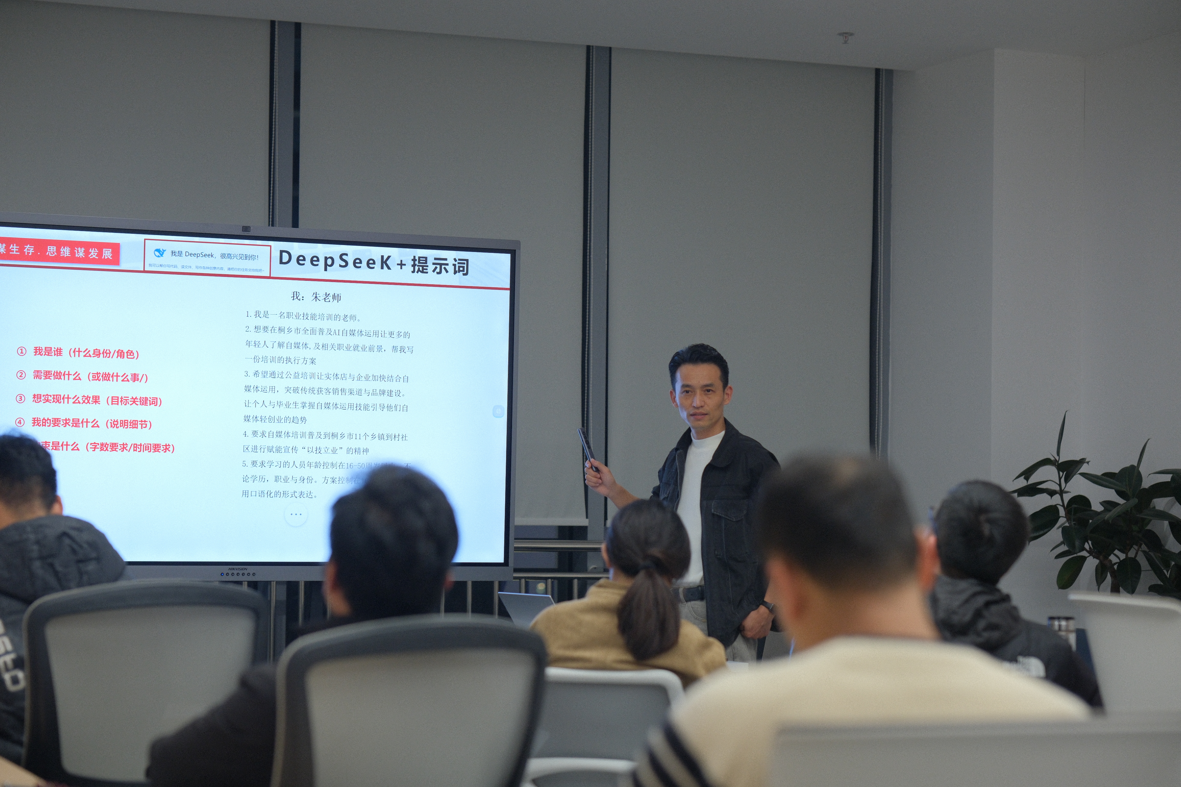 在工具教学环节,朱老师梳理了主流AI创作工具的功能矩阵与适用场景。针对营销文案撰写,他以DeepSeek为例,演示如何通过结构化提示词设计,快速生成兼具传播力与转化率的营销脚本;在短视频创作领域,导师对比了文生视频工具(如即梦AI、Luma AI)与数字人平台的操作逻辑,指导学员根据内容需求灵活选型。学员们现场体验了“AI生图+数字人播报”的组合应用,仅用1小时便完成从素材生成到视频合成的全流程创作,直观感受到AI技术对创作效率的指数级提升。